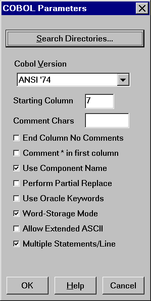 It is sometimes necessary to modify the parameters of a component after it has been added to a project. Revolve provides the COBOL Parameters feature to facilitate component level parameter definition. This is different from the Component Parameters functionality available through the Administrator Options dialog (Utilities/Options/Admin...) in that these parameters are applied to existing, selected components (component level), as opposed to effecting all components, new and existing, across the project (project level).