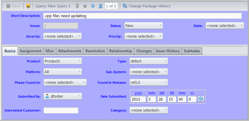 • If you click theShow Issue Details button in the toolbar of the Query Results pane, an Issue form pane appears below it. This pane is a fully functional Issue form, which you can use to view and modify the issue record currently selected in the Query Results pane. A user preference (Tools > Preferences) configures this pane to appear automatically when you open a Queries tab.