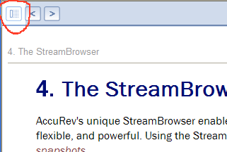 If you click on Help > Help Contents & Manuals, AccuRev opens a browser that includes a navigation pane, containing Contents (TOC), Index, and Search tabs.If you click on a Help button or the F1 key, or click on the Help menu option for “This Screen”, AccuRev displays context-sensitive help focused on the topic of interest. In this case, the navigation pane is collapsed to save screen space, but it can be displayed by clicking the Show Navigationbutton in the upper-left corner of the display.