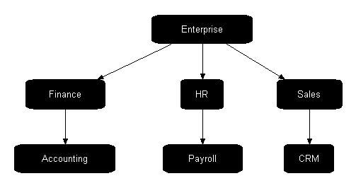Each member of a grouping is identified by a tag, "Payroll," for example. Each grouping can, in turn, reference a more inclusive grouping, "HR," for instance. The figure below shows the tag hierarchy for a typical enterprise: