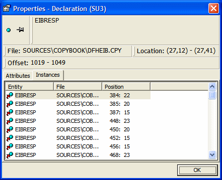 From the declaration, you can generate a list of instances in which the variable is used. Select the declaration in the Context pane and choose Edit > Instances.