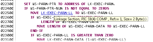 - Clicking a data item or paragraph name highlights all their occurrences in the code.