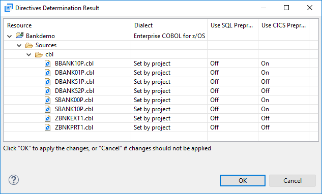The IDE performs a scan of the files and shows a report of what directives for dialect and for CICS must be set on the programs in your project in order for them to compile cleanly.