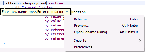 To specify whether you want to rename with or without the Rename dialog box, click Window > Preferences > Micro Focus > COBOL > Editor and either check or uncheck Rename in editor without dialog (enabled by default).