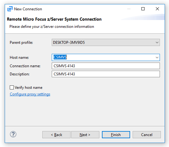 In order to test the connection to z/Server from an EDz client you must define a Micro Focus z/Server connection in the Remote Systems view: