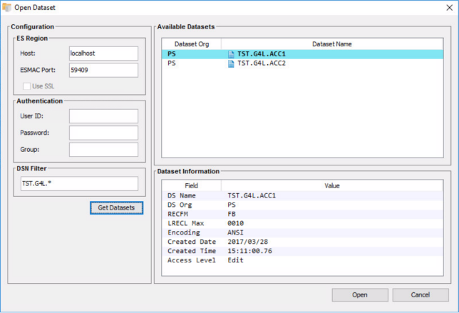 You connect to the Enterprise Server region specified, and the data sets that you have permission to update appear. If you are using authentication details, and they are either incorrect or do not grant access to any data sets, a message appears.