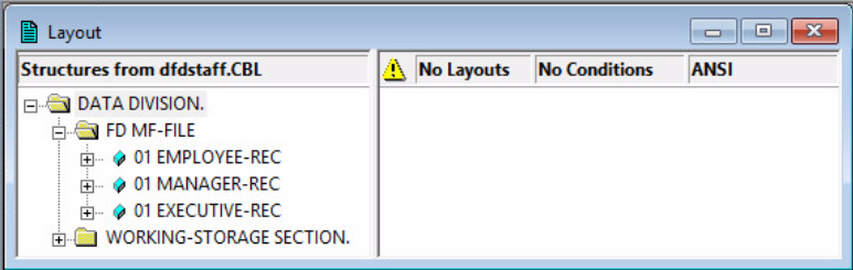 The datavseq.dat data file contains three types of record: employee, manager, and executive. You need to create a layout for each type of record, and then set criteria for when a particular layout is used. Of the three layouts, you define one as the default; all others are defined as conditional.
