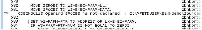 During the build, the Compiler produces a source listing file, ZBNKPRT1.lst, in a Listing subfolder in the project directory (C:\MFETDUSER\Bankdemo\Projects\Studio\Bankdemo\Listing in this case). The listing file includes a fully expanded source file together with some Compiler system information at the start and with any Compiler errors highlighted with asterisks. From Windows Explorer, you can open the file in a text editor such as Microsoft's Notepad and view its contents.