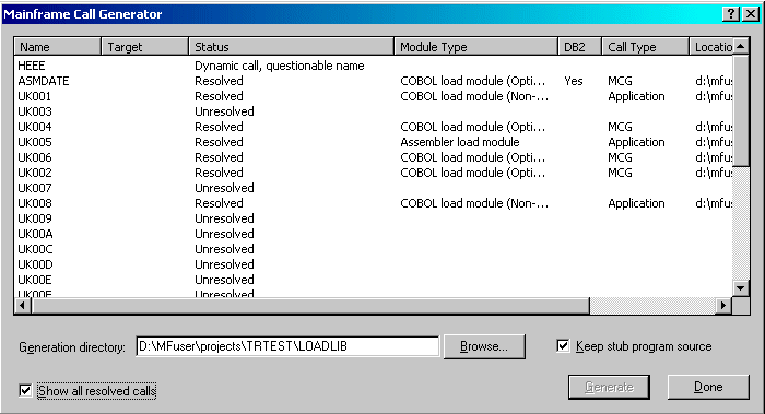 The following list shows the information presented by the Mainframe Call Generator dialog box: