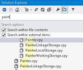 You can use the search field in Solution Explorer to search for files in your solution. Searching also finds copybooks in the copybook dependency view even if they are not part of any of the projects in the solution:
