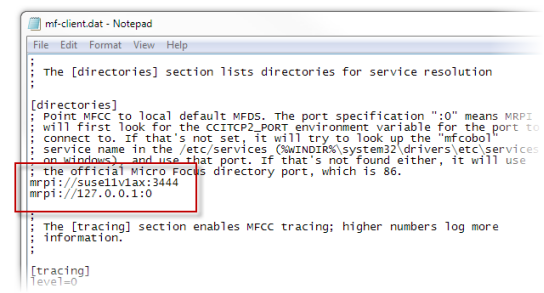 Note: The mf-client.dat file is located in the bin directory of your product installation directory. We recommend that you take a copy of this file, update the copy, and use the MFC_CONFIG environment variable to point to the updated file.