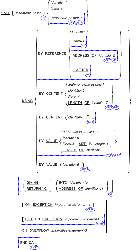 phrase is specified in the CALL statement, control is transferred to imperative-statement-1. Execution then continues according to the rules for each statement specified in imperative-statement-1. If a procedure branching or conditional statement which causes explicit transfer of control is executed, control is transferred in accordance with the rules for that statement; otherwise, upon completion of execution of imperative-statement-1, control is transferred to the end of the CALL statement