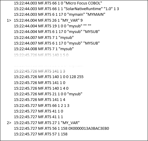 When you rerun mymain, the trace file created contains additional entries for external data items. If you have compiled the programs with the AMODE directive, there would also be entries for each of the Mainframe Pointer Manager events. The trace file looks similar to the following: