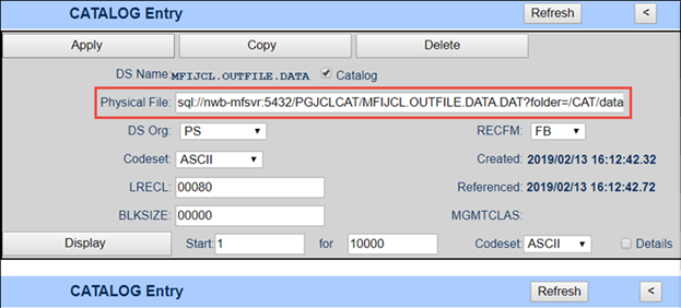 The example shown above creates a catalog.dat file, if one does not already exist, within the CAT folder in the PGJCLCAT datastore. The Default Allocated Dataset Location setting creates a sub-folder from the location of the catalog file for any cataloged data sets. These two options form the values of the MFSYSCAT and MFALLOC_LOC environment variables respectively.