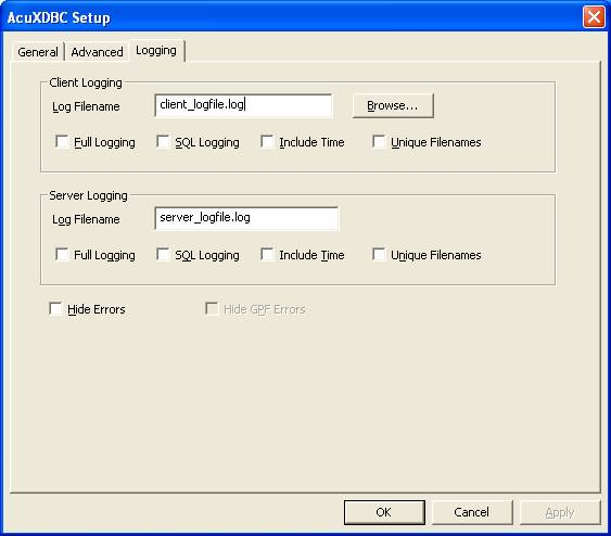You can gather information from AcuXDBC to help you troubleshoot server processes and debug your client applications. Into the Logging tab, enter the information that is requested or accept the defaults, then click OK.