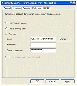Click the Identity tab. The dialog box depicted below displays the current Run As configuration.