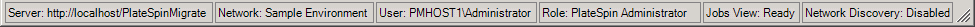Status bar: At the bottom of the PlateSpin Migrate Client window, the status bar displays the PlateSpin Server that the client is currently connected to, the PlateSpin Migrate Network you are currently working with, the name and role of the current user logged in, and the status of the Automatic Network Discovery feature. See Status Bar.