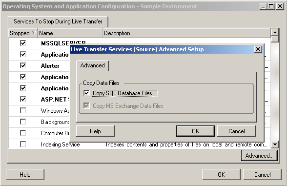 To indicate that you want SQL Server and Exchange Server database files copied during the migration, click Advanced (applicable to Windows systems only).