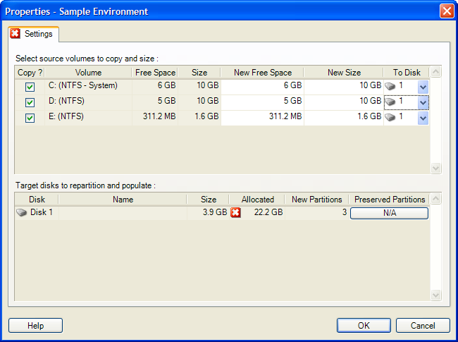Use these settings to select source volumes to copy, non-volume source spaces to re-create and size, and target disks to repartition and populate.