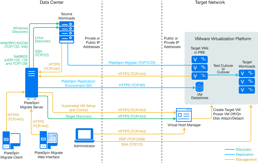 NOTE:Figure 13-1 and Figure 13-2 depict automated discovery and the network requirements for Windows and Linux workloads. You can alternatively use Migrate Agent on the source workload to register the workload and send its inventory details to PlateSpin Migrate server using HTTPS (TCP/443). See Requirements for Workload Registration and Registering Workloads and Discovering Details with Migrate Agent.