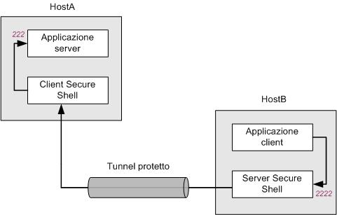 Il server dell'applicazione e il client Secure Shell vengono eseguiti su HostA. Il server Secure Shell e il client dell'applicazione vengono eseguiti entrambi su HostB. Tutti i dati inviati alla porta 2222 di HostB vengono inoltrati alla porta 222 di HostA. In questa configurazione, tutti i dati in transito vengono crittografati in maniera protetta. Questo comando configura quanto segue: