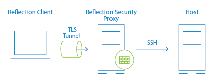 In a standard Administrative Console configuration for a secure Reflection session, the connection between the client and security proxy server is encrypted using TLS, but the connection between the security proxy and the host uses unencrypted Telnet. By sending an SSH-encrypted connection through the security proxy tunnel, you can configure a secure Reflection session so that the entire communication path is encrypted from the client, through the proxy server, and on to the host.This feature has the following advantages: