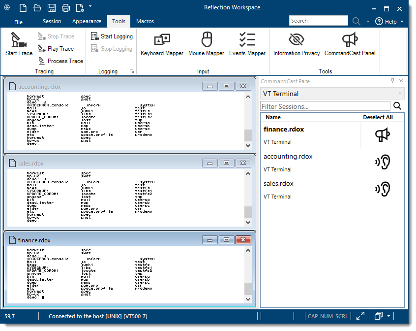Puede seleccionar las sesiones a y desde las que desea realizar una difusión en el Panel de CommandCast. Los comandos introducidos y la salida resultante se muestran en todos los equipos host a los que se está difundiendo.