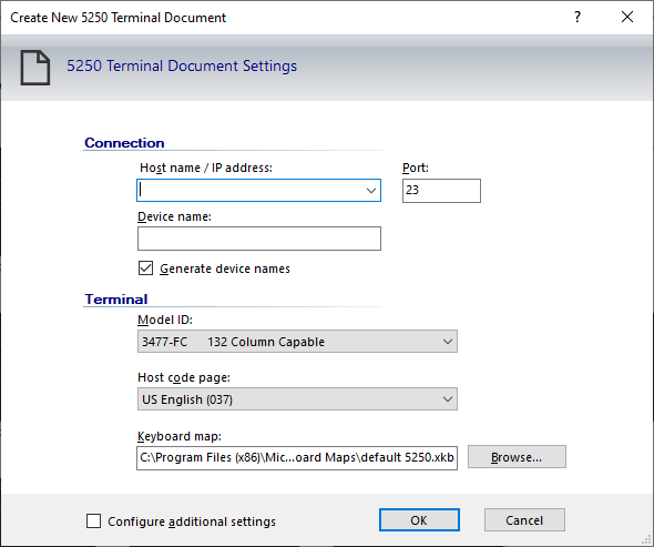 Boîte de dialogue Créer un nouveau document de terminal 5250