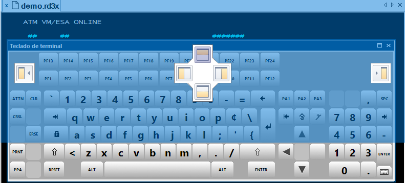 Para acoplar el teclado al espacio de trabajo, seleccione la barra de título del teclado y mueva el punto de mira a una de las flechas superior, inferior, izquierda o derecha que se muestran por encima del teclado.
