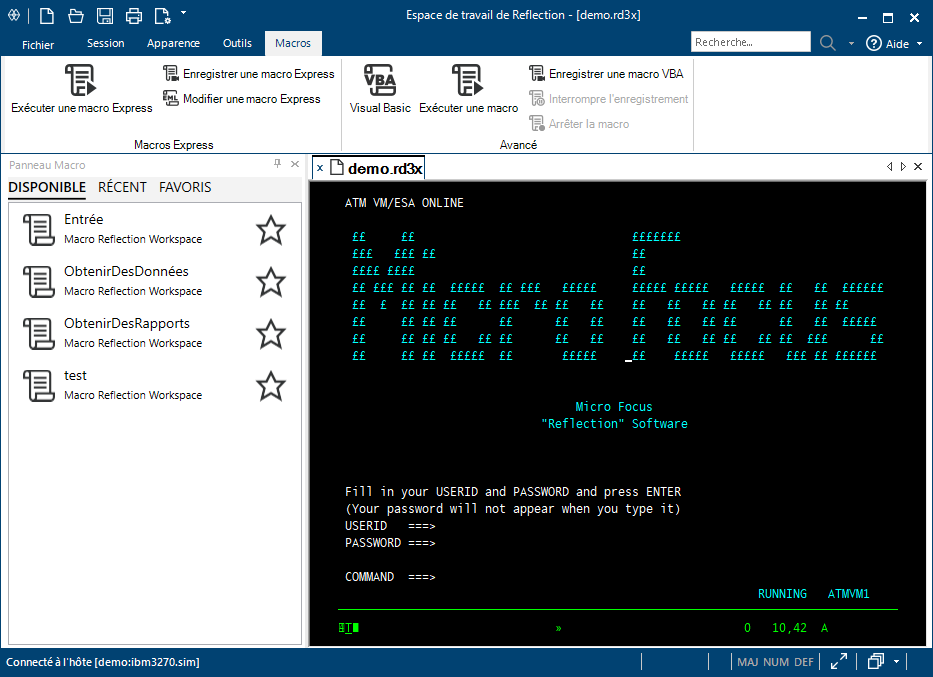 Vous pouvez exécuter les macros VBA créées dans Reflection, ainsi que la plupart des macros créées à l'aide des produits Extra! et Reflection hérités. Vous pouvez également exécuter la majorité des macros créées à l'aide des produits Micro Focus Rumba, IBM Personal Communications, OpenText HostExplorer et Brandon Systems\Jolly Giant QWS3270. Cependant, vous ne pouvez exécuter des macros que sur des emplacements autorisés.