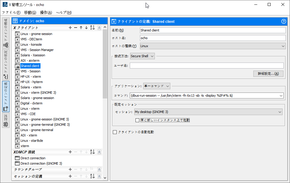 [Xクライアント]の下に、公開Xクライアント定義(この例では「Shared client」)と既定の設定が表示されます。ユーザは個人用定義を編集できますが、公開定義は編集できません。