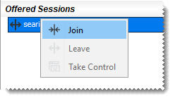 [提供セッション] の下で、ユーザのコンピュータから共有された実行中のセッションを見つけます (ユーザのワークステーションのコンピュータ名を使用して識別されます)。その提供セッションを右クリックして、[参加] を選択します。