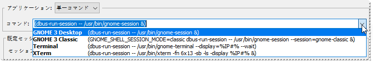 クライアントコマンドで KDE、CDE、GNOME などのデスクトップ環境を起動する場合は、[クライアントを X 端末のデスクトップに表示する] に設定されたセッションを選択します。「X 端末のデスクトップ」というサンプルセッションがこの設定を使用します。これらのクライアントの場合は、[常に新しいインスタンス上で起動] もオンにします。