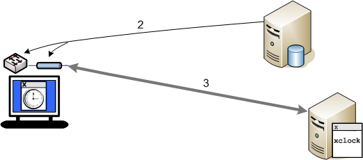 The X protocol flows directly from the X client to the session on the workstation. (See the arrow labeled 3 in the following illustration.)