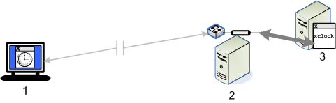 When the Remote Session Services feature is enabled, session components are set up on a remote computer. This can be on the X client host or on a nearby computer (as shown in this diagram). With this configuration, protocol that passes between the domain node and your workstation is compressed. (Protocol that passes between the client and the domain node is not compressed.)