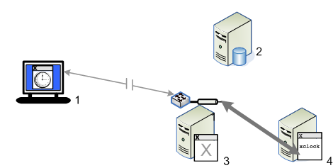In this configuration, the session runs two joined X servers. An X server display runs on the user workstation (1). This server creates the visual display of the X client application. An additional headless X server A special type of X server that has no display. It maintains display contents in memory and serves to keep a session "alive" when no other X servers are connected. It can also provide short-circuiting of certain X protocol requests. (3) runs on a domain node located on or near the X client application. When a session is established, all X protocol passes between the X client application (4) and the headless server. Only the protocol required to update the display is sent to the workstation. Because many X protocol queries don't need to be sent to the workstation, this configuration improves performance by reducing the amount of traffic that needs to pass over the network. Reflection X Advantage also compresses the protocol that flows between the user workstation (1) and the domain node (3).