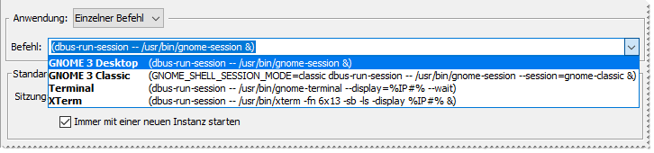 Wenn mit Ihrem Clientbefehl eine Desktopumgebung wie z. B. KDE, CDE oder GNOME gestartet wird, wählen Sie eine Sitzung aus, für die Clients auf Desktop des X-Terminals anzeigen konfiguriert ist. Die Beispielsitzung mit der Bezeichnung "X-Terminaldesktop" verwendet diese Konfiguration. Aktivieren Sie für diese Clients auch die Option Immer mit einer neuen Instanz starten.