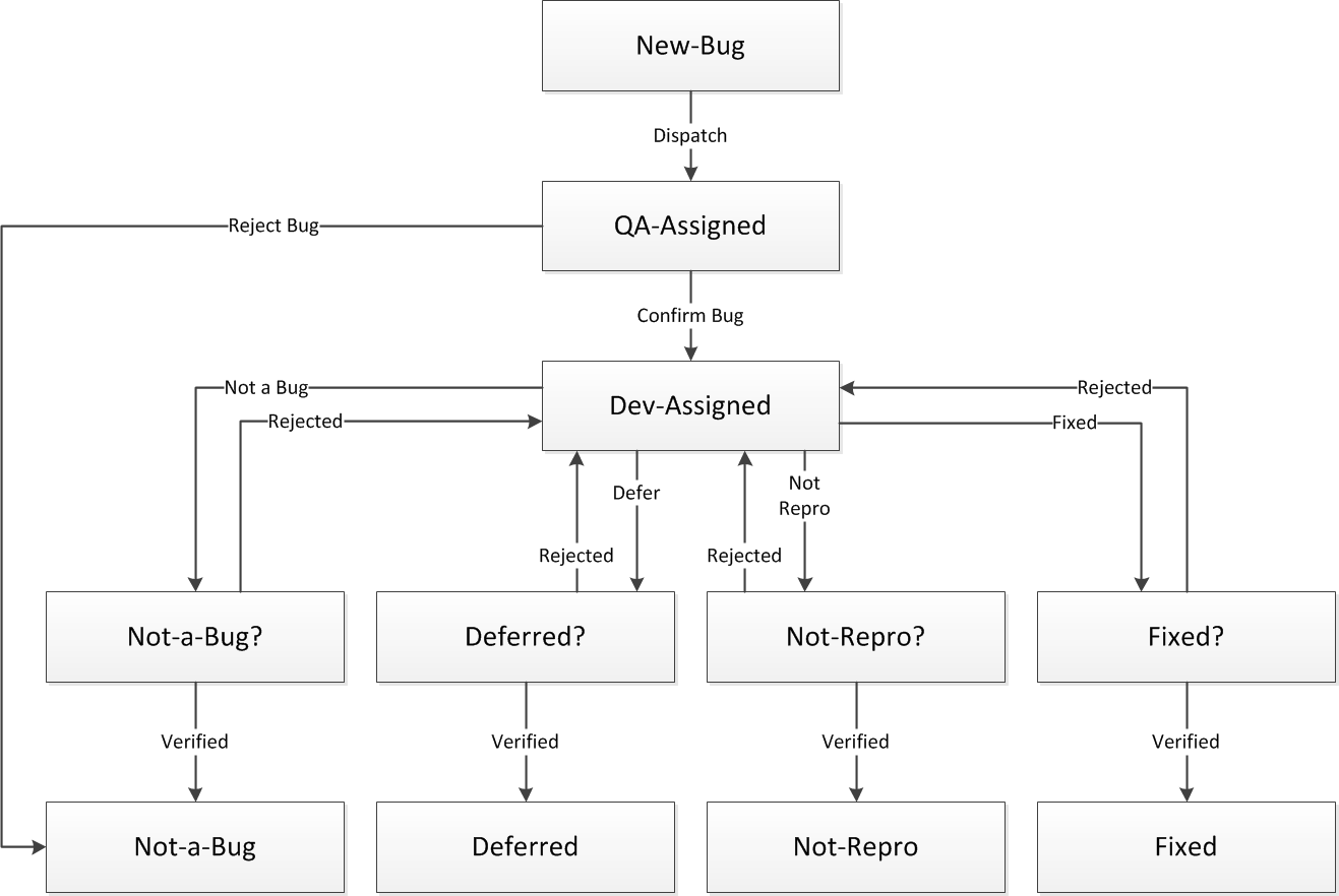 また、問題がたどる各過程の検討中に、正のアクションが不足していることがわかる場合もあります。たとえば、QA エンジニアも問題レポートを却下し、結果としてその問題を完了させる場合もあります。次に示す例の図では、QA エンジニアによる [バグの却下] アクションにより、[非バグ] 状態に移行します。すべてのアクションが最終的には最終状態に至ることを確認します。