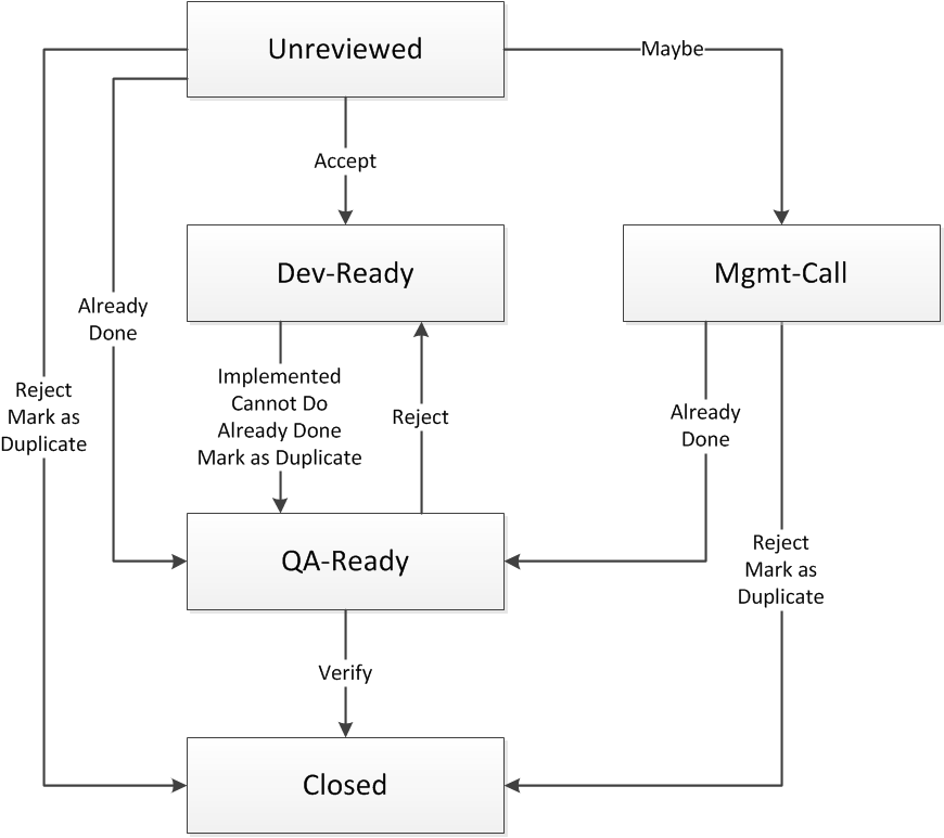 初期レビュー担当者または管理チームが機能拡張要求を却下すると、問題は [却下] の理由コードで完了します。この [却下] アクションは、[QA 準備完了] 状態の問題に対して実施される [却下] アクションとは異なります。この場合は、開発アクション ([実装済み]、[実現不能]、[対応済み]、または [重複として指定]) が議論されます。