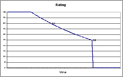 Between b1 and b2 values are interpolated exponentially. This also applies to values beyond b1, unless the interpolated value is higher than 100. In such cases the performance rate is determined to be 100.