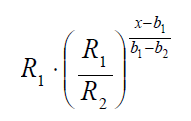 The formula that is used to interpolate the rating curve is an exponential curve through the two points (b1, R1) and (b2, R2):