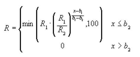 Where b1 and b1 are the boundaries, R1 and R2 are the corresponding performance rates, and x is the measured value.