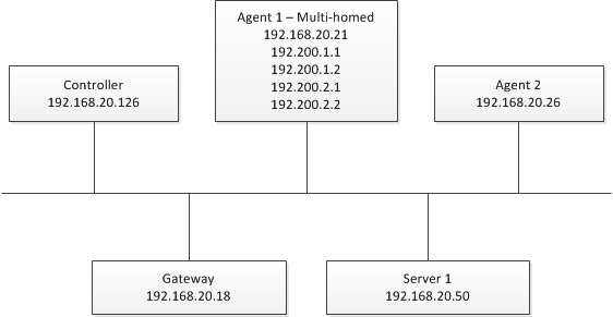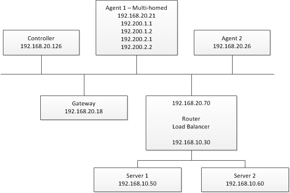 以下の例では、サーバー 1 は、エージェント 1 からのパケットを受信し、192168.20.50 から 192.200.2.1 へ返信しようとします。サーバーの設定を修正していない場合は (エージェント 1 がマルチホームであることはサーバーは知らないことを意味します)、サーバー 1 はパケットをデフォルト ゲートウェイに送信します。これは、ルーティング テーブルの一致するエントリが唯一であるためです。