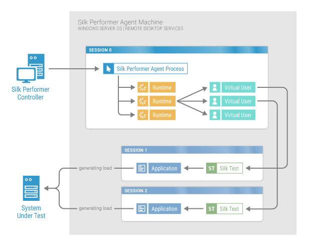 マシン上または単一セッションで、アプリケーションの複数のインスタンスを実行できない場合があります。そのため、各仮想ユーザーが、エージェント マシン上で新しいセッションを作成します。このアプローチでは、Silk Performer はアプリケーションの複数のインスタンスを作成します。これらすべてがテスト対象のシステムに同時にアクセスします。