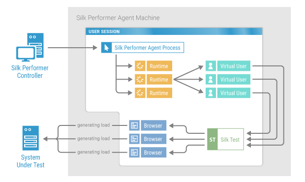 Google ChromeMozilla Firefox を使用した Web アプリケーションに対するテストでは、Silk Performer はすべての仮想ユーザーを単一の Windows セッションで実行することができます。このメリットとして、リモート デスクトップ ライセンスが不要なこと、仮想ユーザーごとのリソース消費が従来の GUI レベルのテストでのアプローチと比較して大幅に低いことが上げられます。