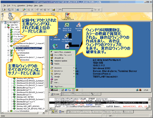 TrueLog Explorer は、オプションで、スクリプトの試行の実行中に Citrix Player と一緒に開くことができます (それには、スクリプトの試行 ダイアログ ボックスで TrueLog Explorer によるアニメーション実行 チェック ボックスをオンにします)。TrueLog Explorer は、スクリプトの試行の実行中に実際にダウンロードされたデータを表示します。記録中にアクセスされた主要なウィンドウは、TrueLog Explorer のメニュー ツリーの最上位 API ノードとしてそれぞれ表示されます。それらのウィンドウに対して記録されたアクションは、サブノードとして表示されます。