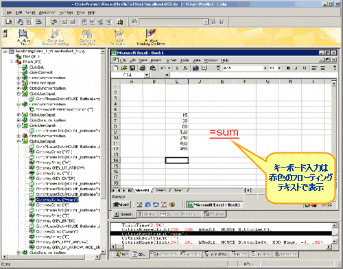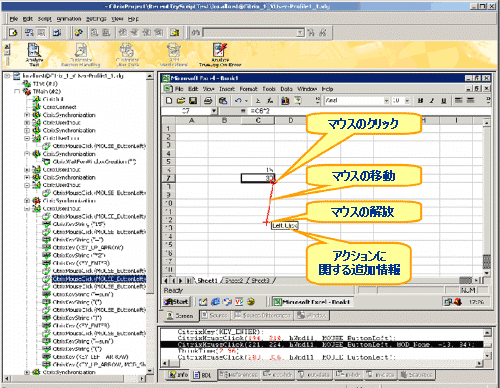 ユーザー入力ノード (CitrixUserInput とそれに関連する関数) には、キーボード入力とマウス入力が反映されます。 CitrixMouseClick 関数には、2 つの追跡ベクトル パラメータ (X 座標と Y 座標) があります。赤色の四角は、マウスをクリックした始点を示し、赤色の十字は、マウスを解放した点を示します。始点と終点の間の赤色の線は、マウスの経路を示します。ボタンが押されている間に移動がなかった場合は、赤色の十字だけが表示されます。オンスクリーン ツールチップには、補足情報(右クリック、左クリック、ダブルクリックなど)が表示されます。